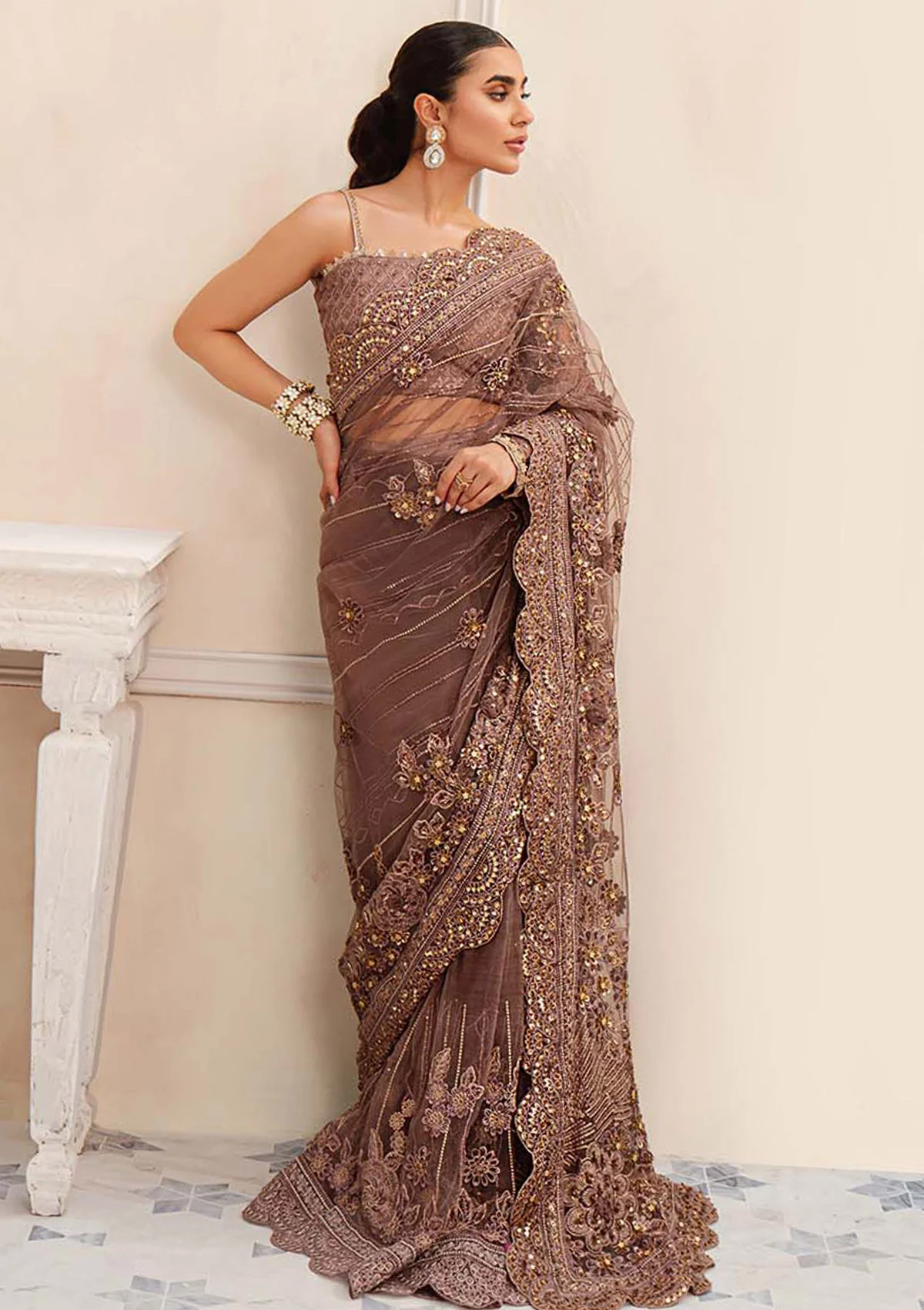A soft raisin mauve is adorned with intricate gold threadworm, delicate beads and glistening sequins in ‘NORA’. The elegant flowing saree is crafted from ethereal net admitted with beautifully delicate florals and motifs to create a timeless work of art. It comes paired with a lusciously embroidered embellished blouse with meticulous detailing to leave an everlasting impression.